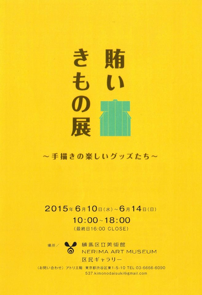 10997708_809436909147296_7456430598858687931_n 練馬区立美術館では久しぶりの開催になりますが、今年はやります! 「賄いきもの展」 2015年6月10日(水)~6月14日(日) 10:00~18:00(最終日は16時CLOSE) 練馬区中村橋駅の練馬区立美術館・区民ギャラリー いつもは着物・帯が中心でしたが、 今年は手描きの染色小物(ストール・スカーフ・帯揚げ・バッグなど?)も予定しています。 みなさま是非お立ち寄りださいね! 2010年より、 「賄い展」「賄いきもの展」 と題して開催しておりますが、 「賄い」って? なに? ・・・と、思われた方もいらっしゃいますよね。 この題に込めたコンセプトについては、 また次回書かせていただきますね♪
